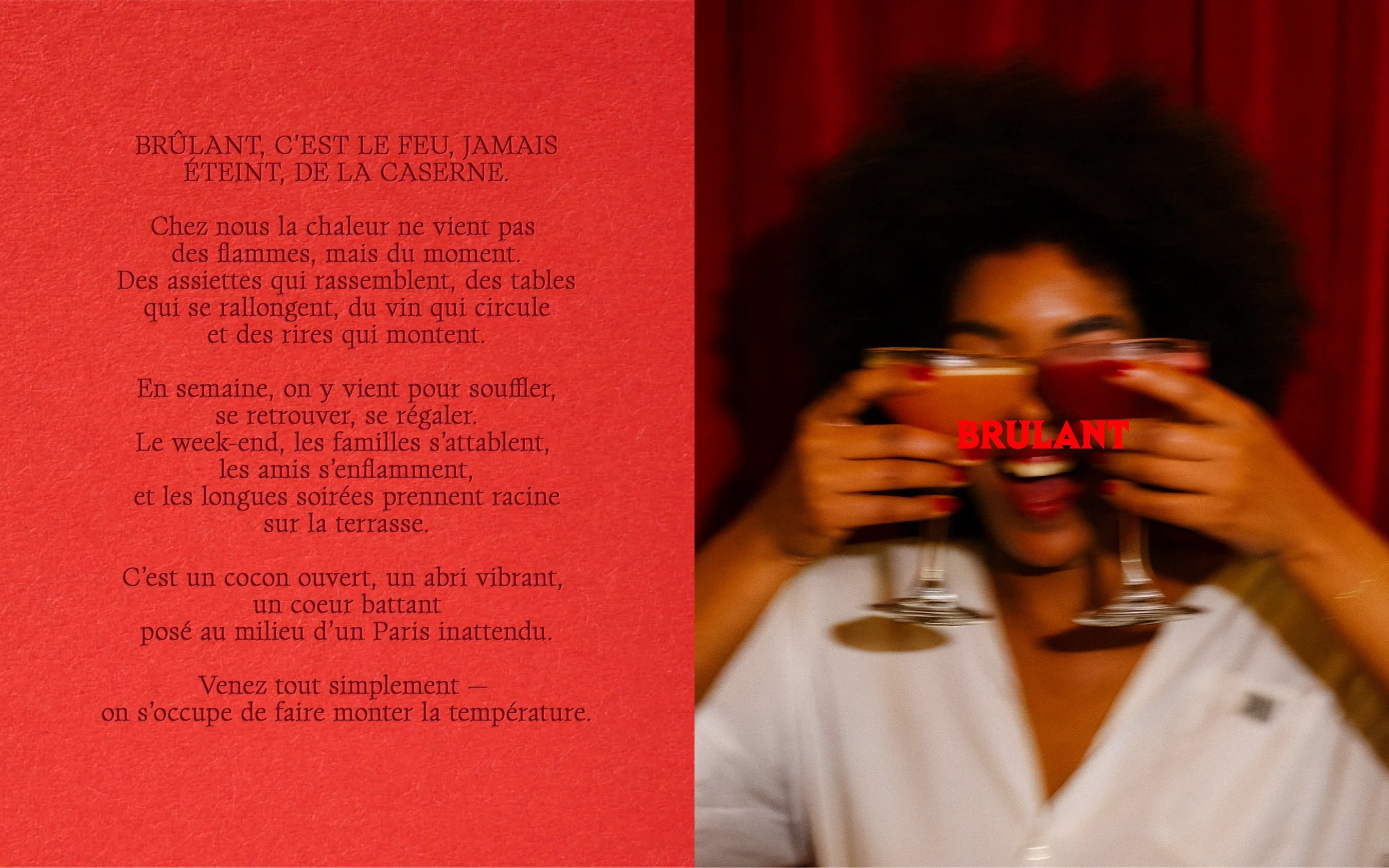 Pour Brûlant, nous avons conçu un branding complet mêlant chaleur, convivialité et caractère. L’objectif : capturer l’âme du lieu, ce feu qui ne s’éteint jamais. De l’identité visuelle à la création de visuels immersifs, en passant par un shooting photo aux tons chauds et naturels, chaque détail traduit l’énergie du partage et la générosité de la table. Brûlant, c’est une expérience sensorielle, un restaurant vivant où la flamme humaine prime sur la flamme du four.