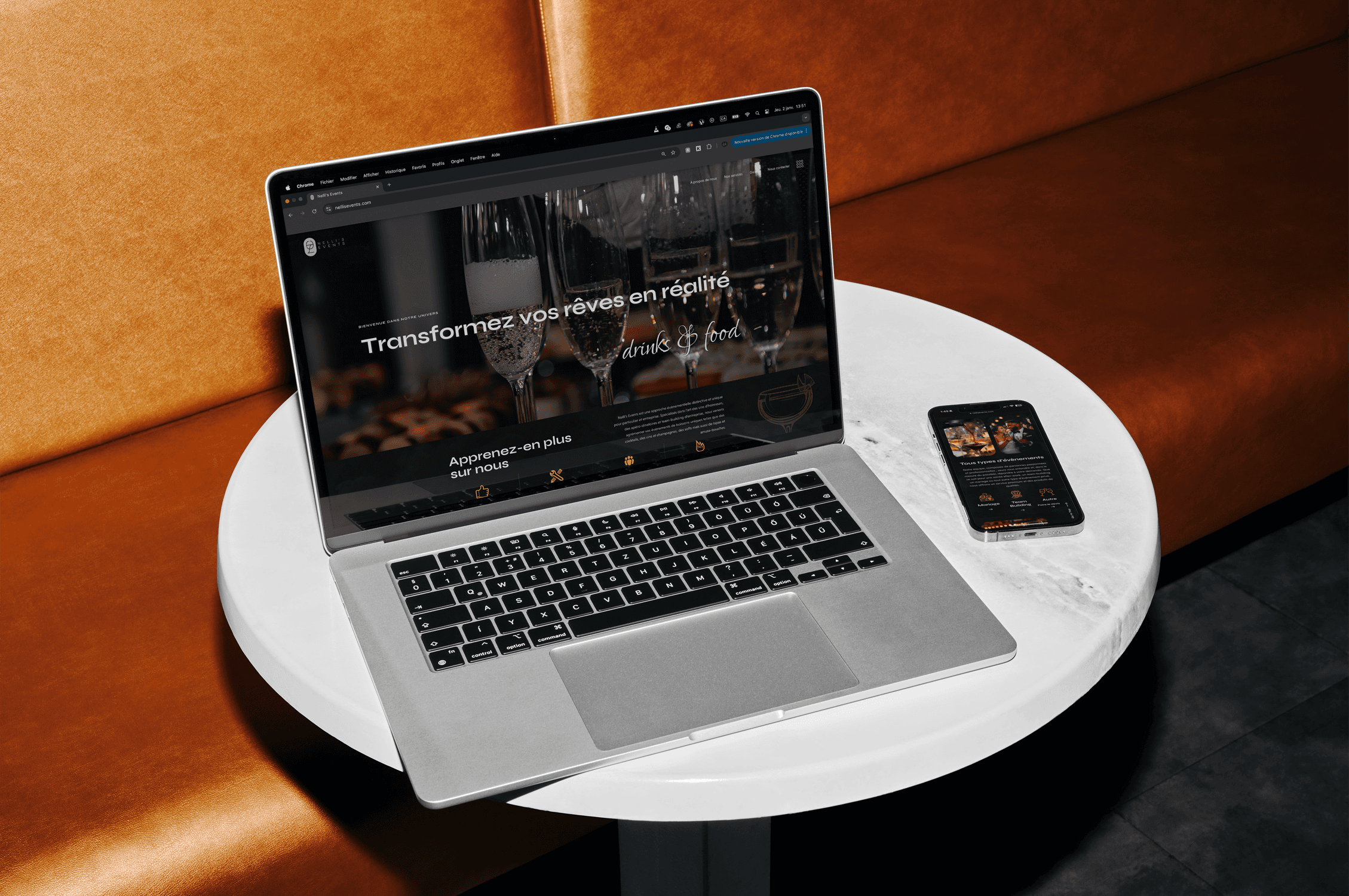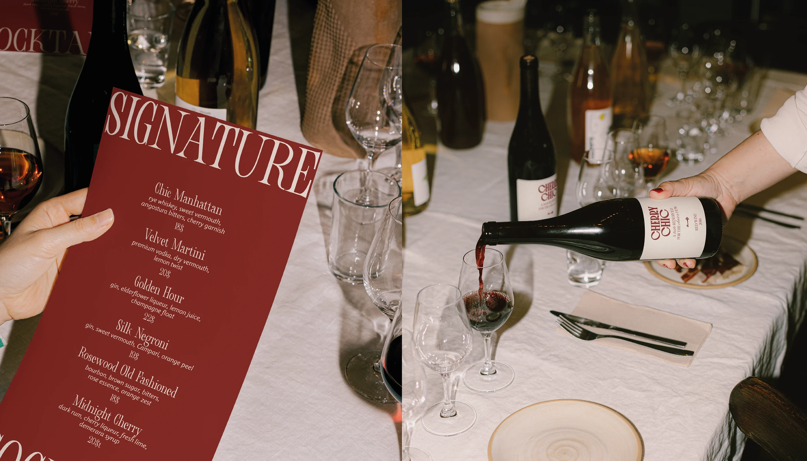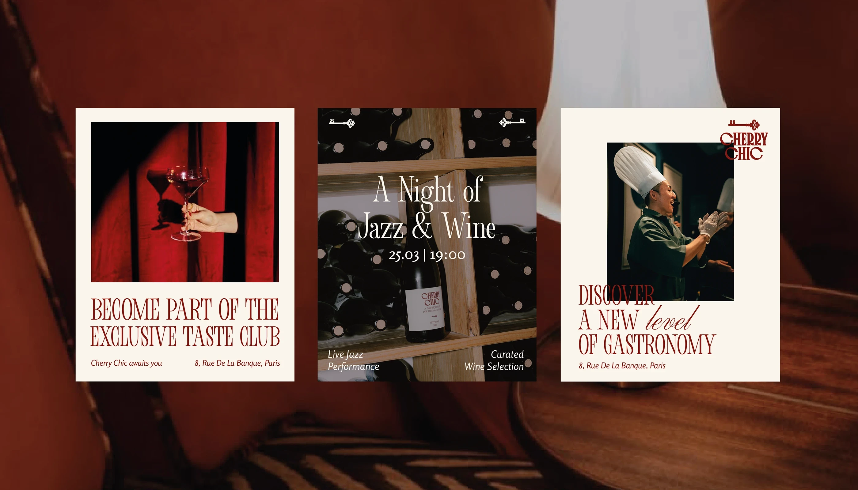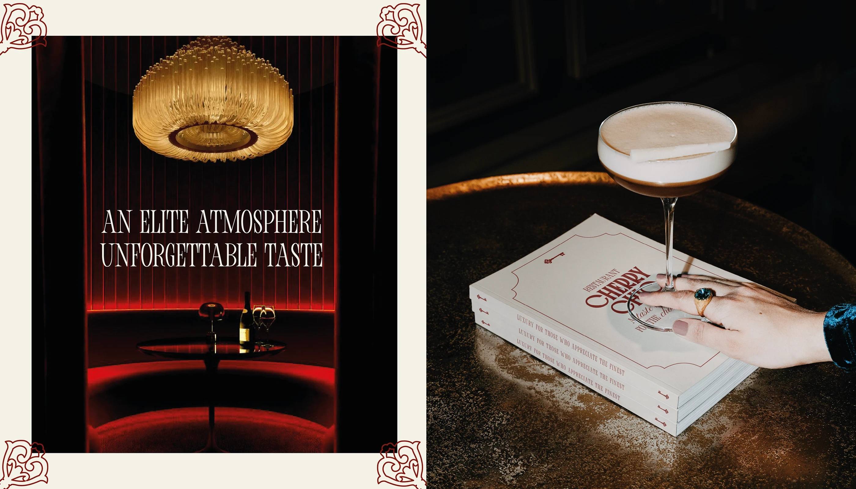 Pour Cherry Chic, nous avons réalisé un branding complet visant à incarner l’élégance et l’exclusivité du lieu. De la création de l’identité visuelle à la production de visuels haut de gamme, chaque élément a été conçu pour refléter l’atmosphère feutrée et raffinée du restaurant. Le shooting photo a permis de capturer l’essence du lieu — des détails de décoration à la lumière tamisée — afin de transmettre cette impression de club privé où chaque instant devient une expérience.